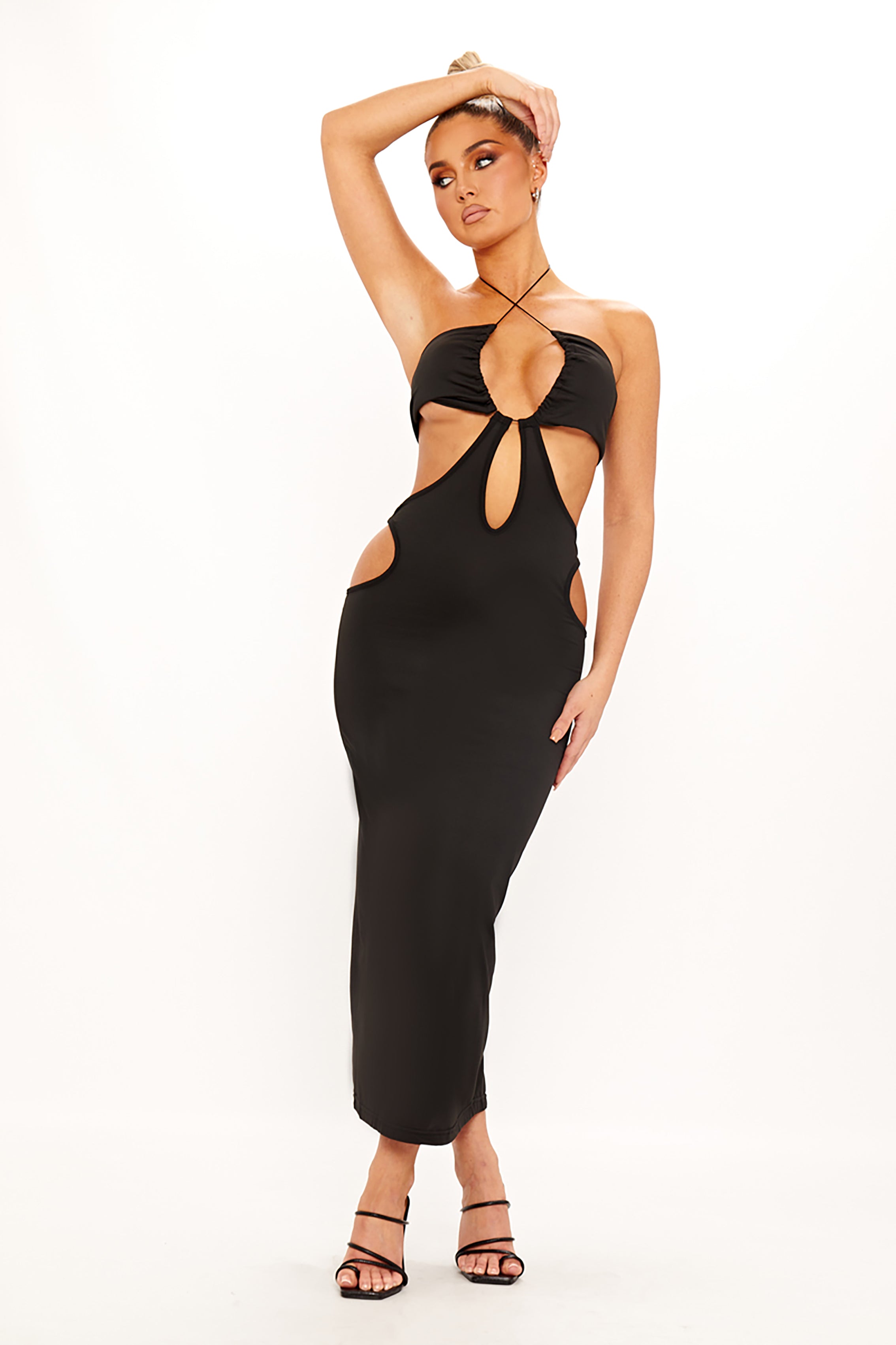 Black Cut Out Tie Detail Bodycon Midi Dress