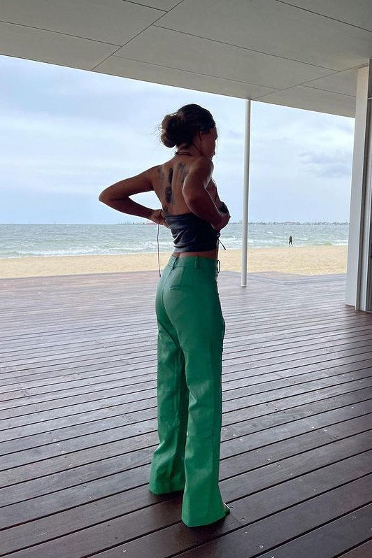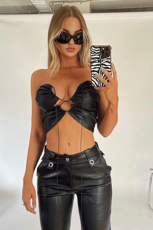 Black Faux Leather Ruched Adjustable Tie Detail Top