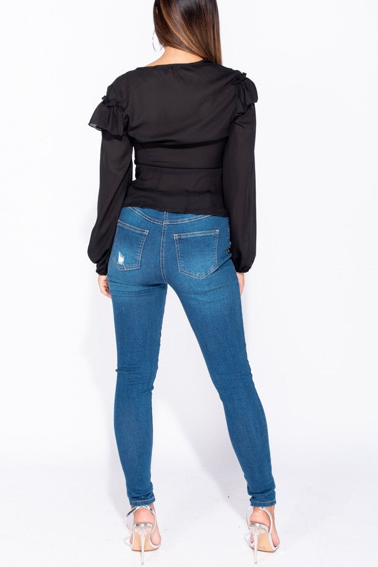 Black Frill Detail Button Front Blouse