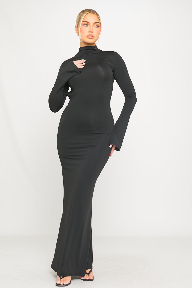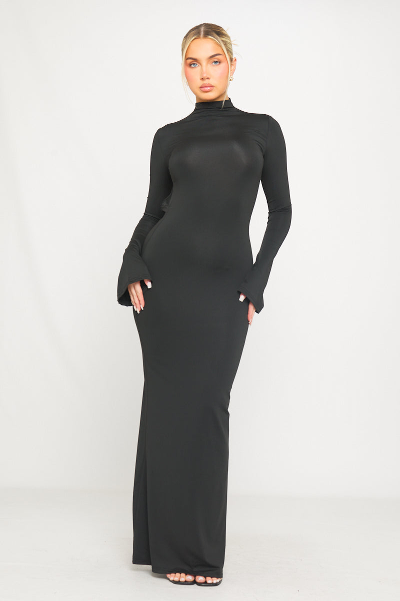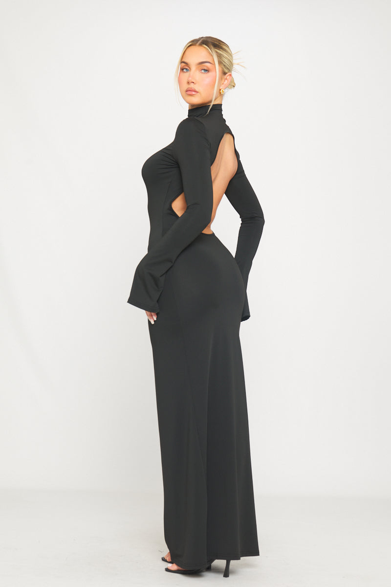 Black High Neck Open Back Flared Sleeve Maxi Dress