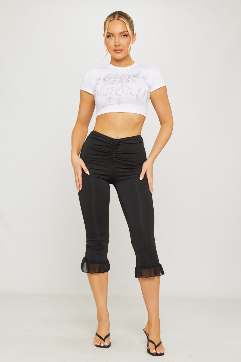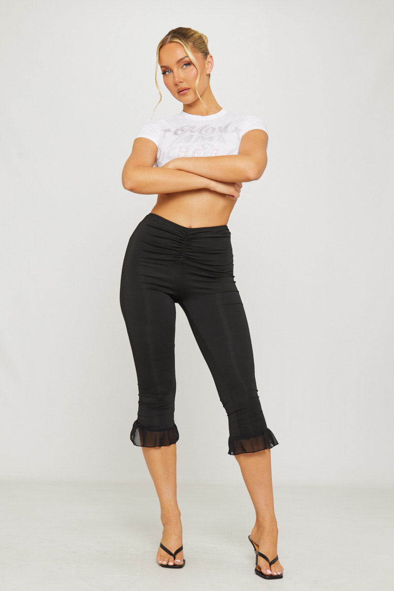 Black Ruched Frill Hem Capri Leggings