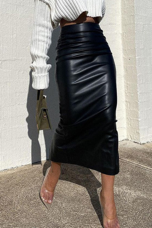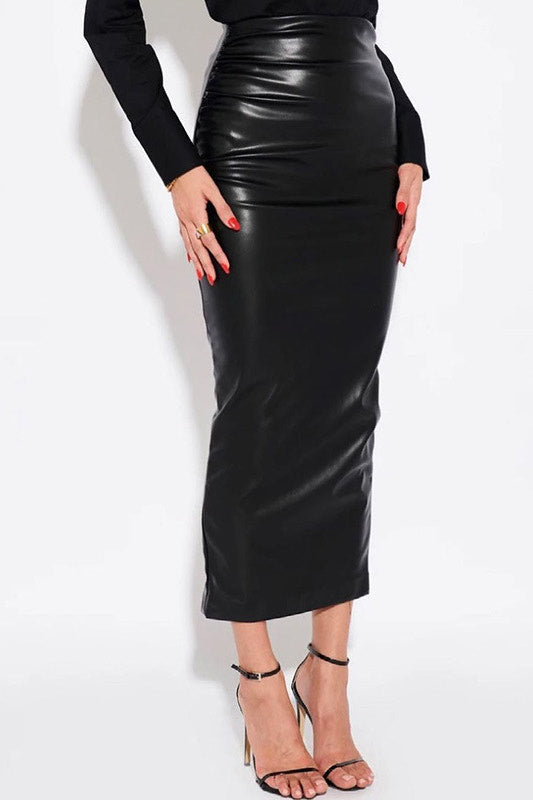Black Vegan Faux Leather Ruched Detail Midi Skirt