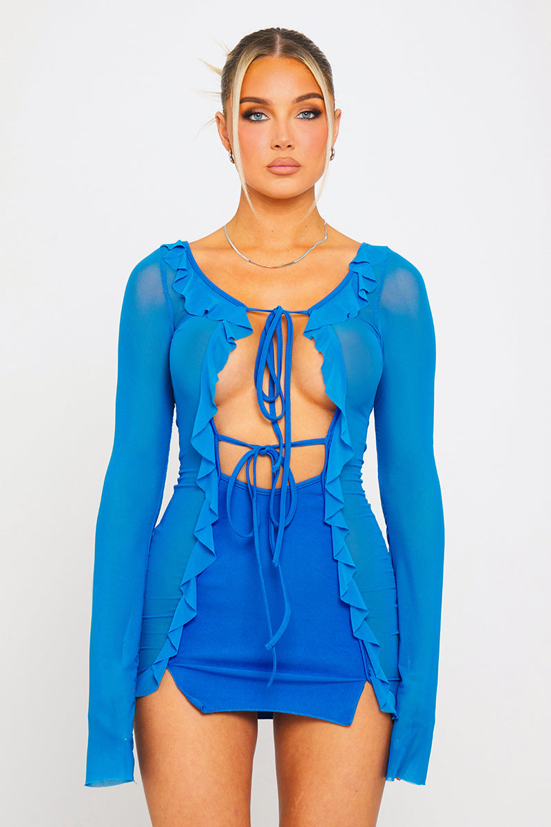 Blue Mesh Ruffle Tie Detail Long Sleeve Mini Dress