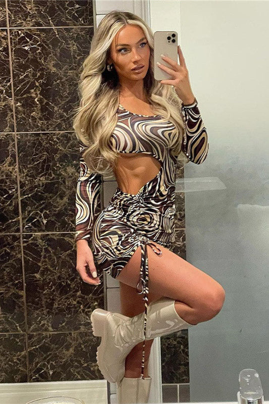 Brown Swirl Print Ruched Front Cut Out Mini Dress