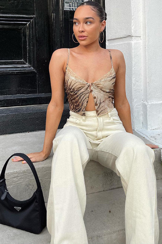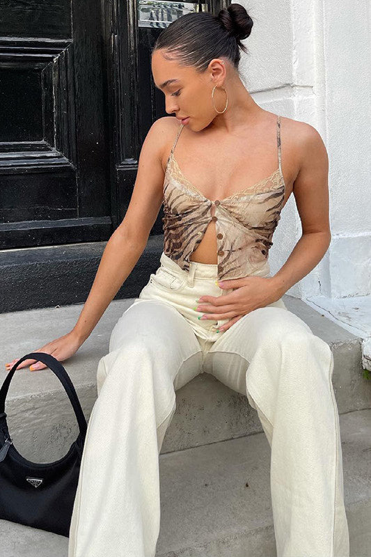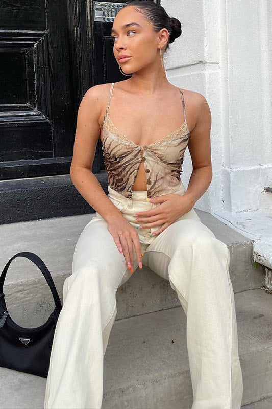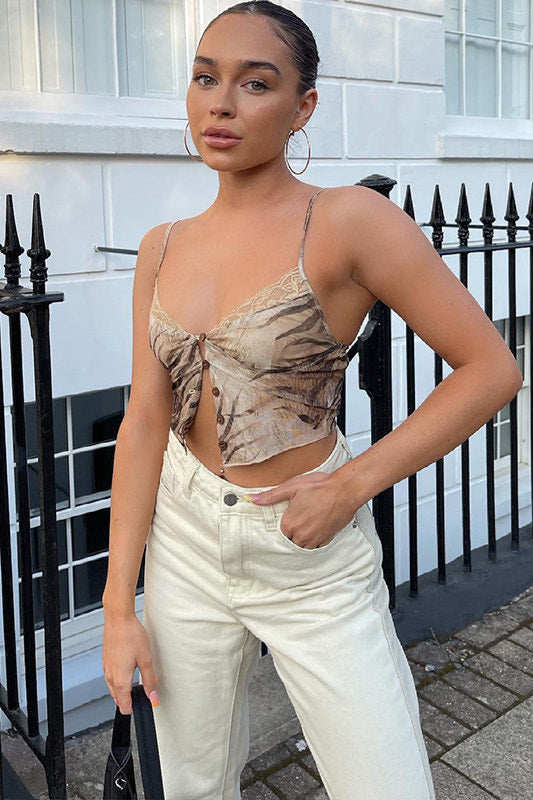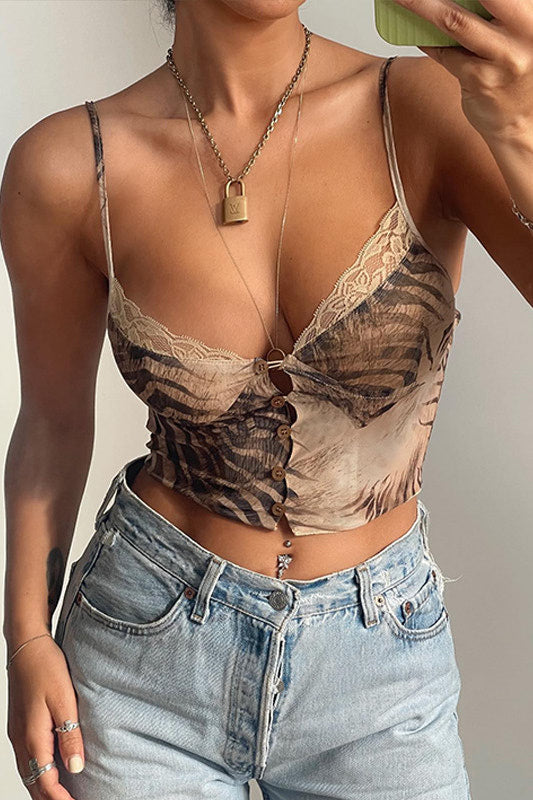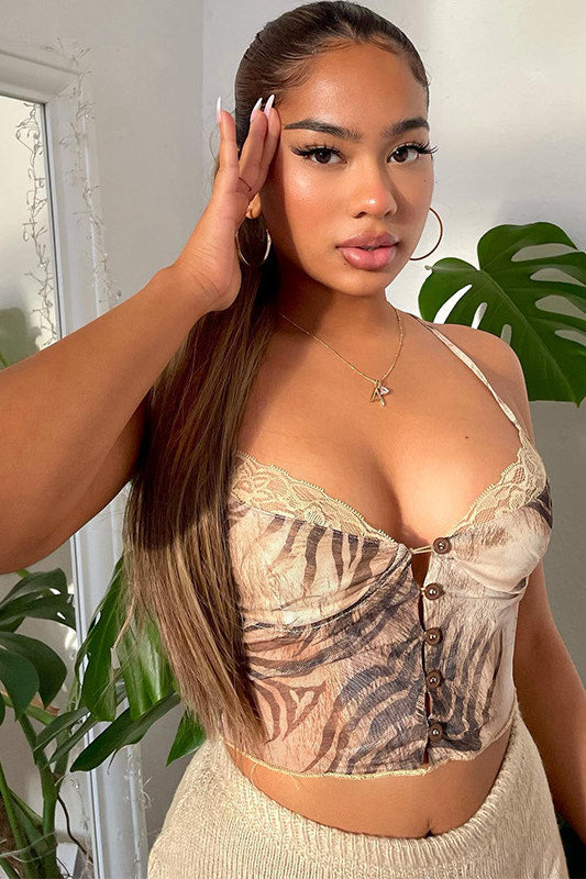 Brown Tiger Print Sheer Lace Trim Crop Top