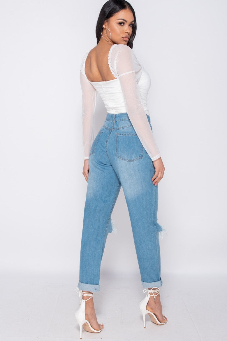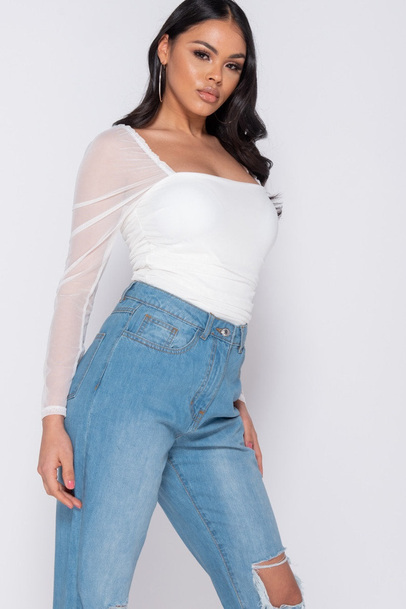 Cream Ruched Sheer Puff Sleeve Bodysuit