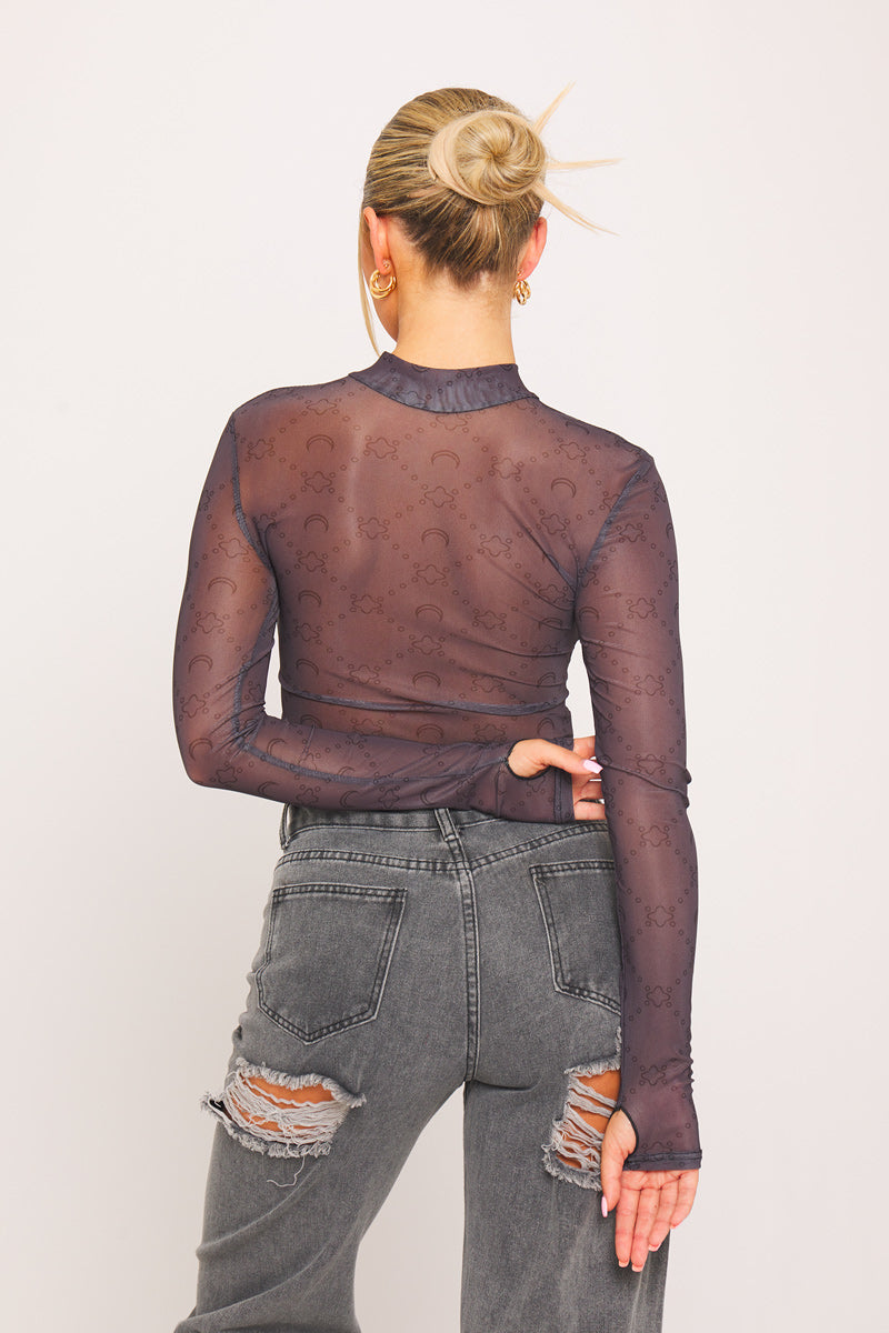 Dark Grey High Neck Monogram Sheer Long Sleeve Top