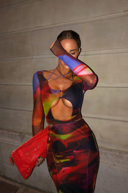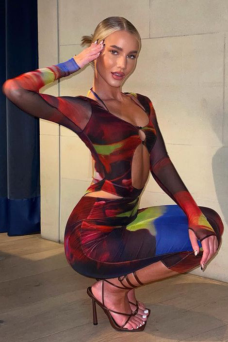 Multi Print Mesh Cut Out Long Sleeve Midi Dress