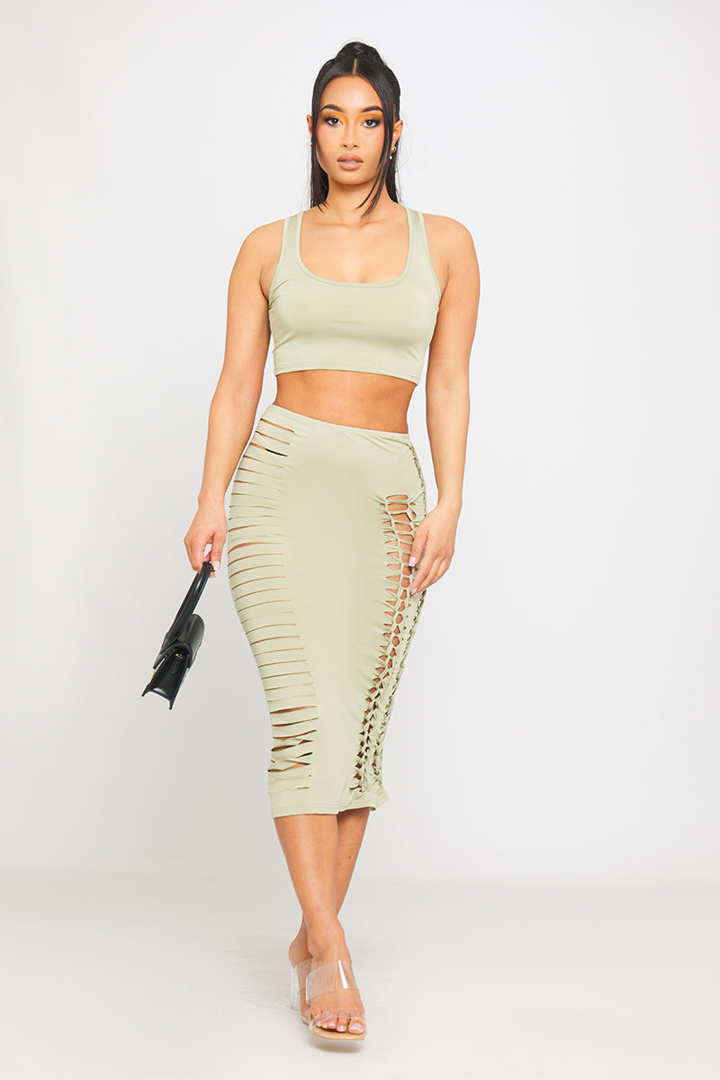 Sage Cut Out Braid Detail Crop Top & Midi Skirt Co-Ord