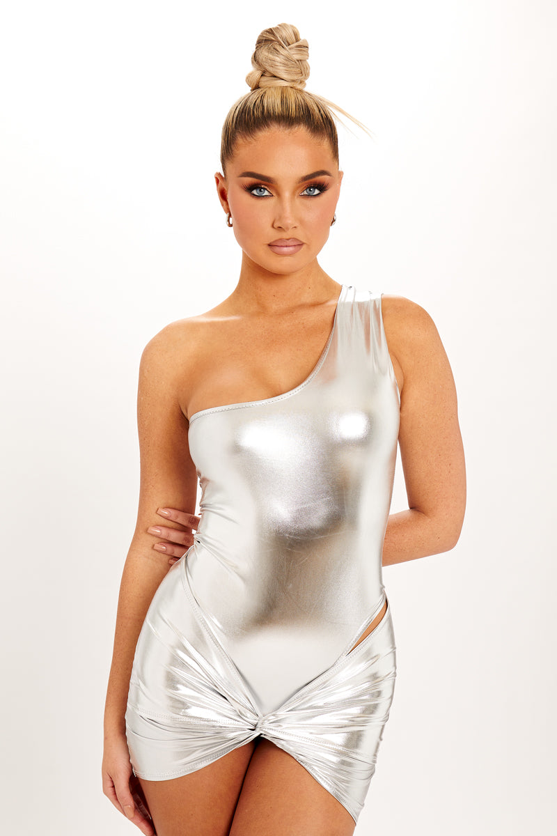 Silver Metallic One Shoulder Bodysuit & Knot Mini Skirt Co-Ord