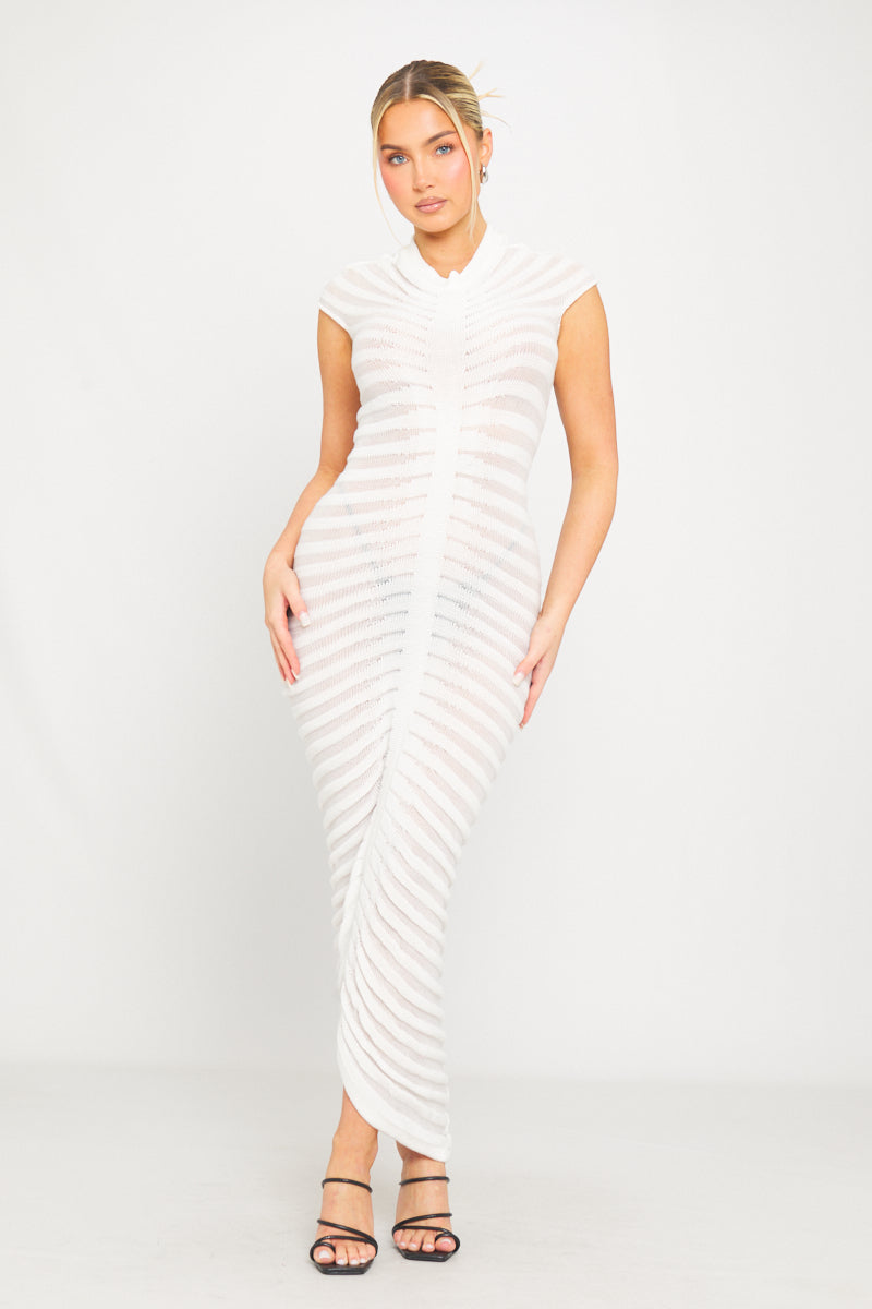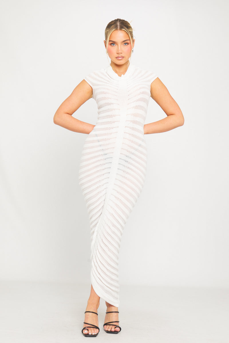 White High Neck Sheer Knit Tube Short Sleeve Midi Dress
