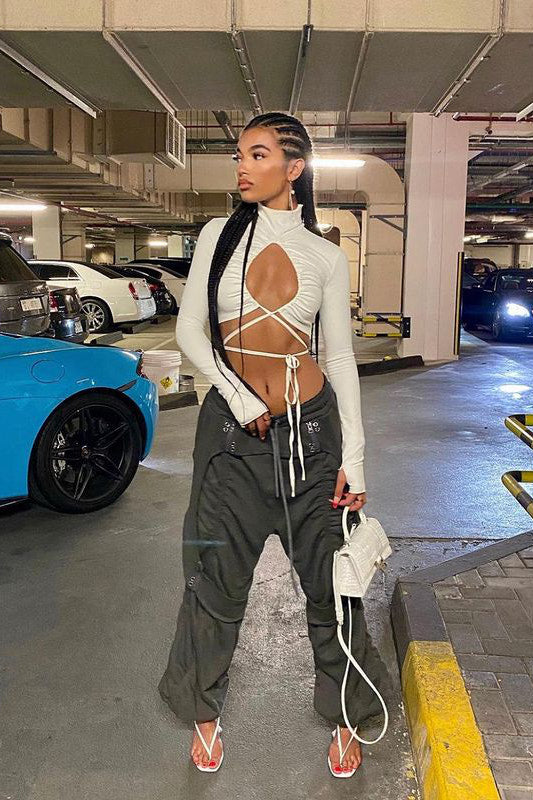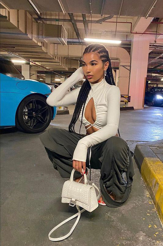 White Keyhole Tie Detail Turtleneck Crop Top