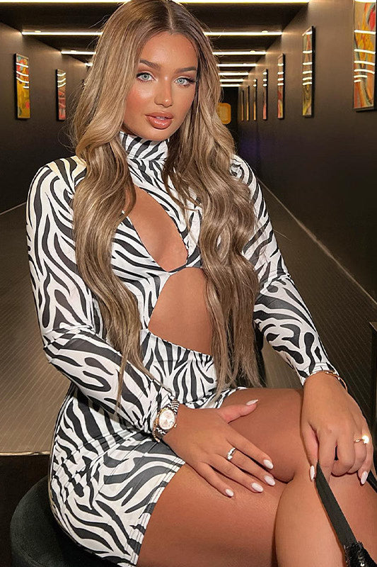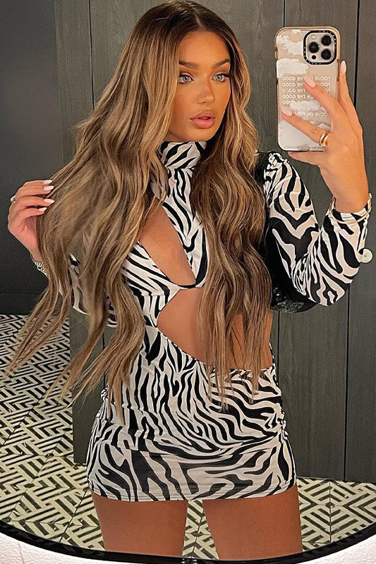 Zebra High Neck Cut Out Split Detail Mini Dress